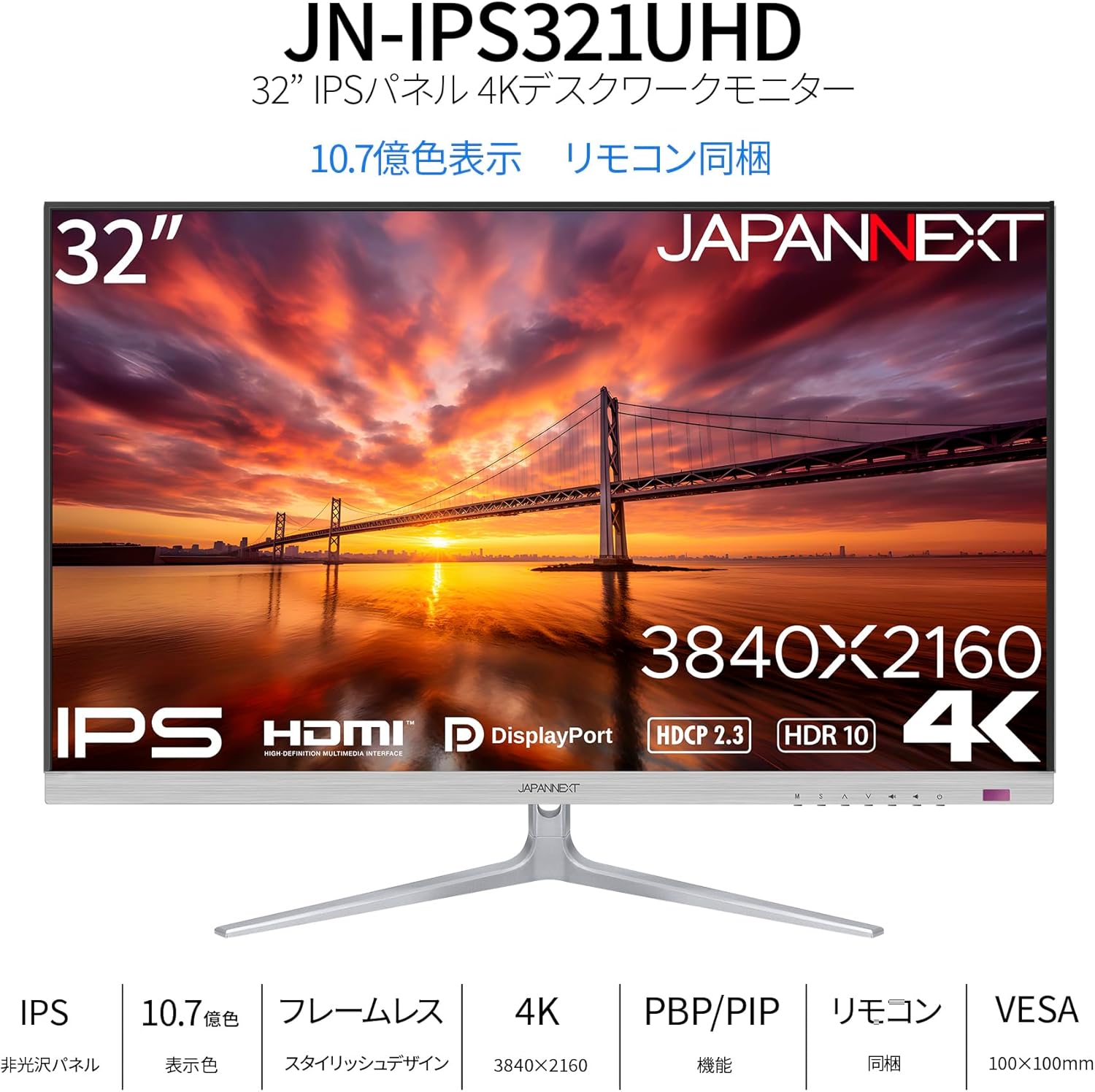 JAPANNEXT JN-IPS321UHDは、32インチの大画面にIPSパネルの鮮明な描写力を備え、4K解像度による広大な作業スペースを低価格で実現した液晶モニターです。